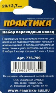 Кольцо переходное ПРАКТИКА 20х12,7 мм для дисков, 2 шт, толщина 1,4 и 1,2 мм