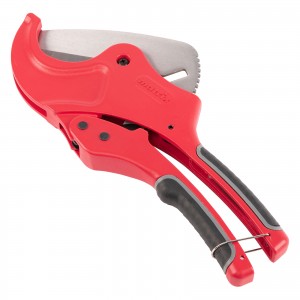 Универсальные ножницы для резки изделий из ПВХ с порошковым покрытием рукояток применяются для разрезания пластиковых труб диаметром до 63 мм, а также профилей, плинтусов, галтелей, реек, планок, резиновых шлангов и других предметов. Механизм автоматического раскрытия. Нож у инструмента прямой, поэтому он может резать плоские заготовки. Ножницы пригодятся для выполнения сантехнических и отделочных работ. Режущее полотно изготовлено из нержавеющей стали (3CR13). Корпус защищен порошковым покрытием. Храповый механизм для удобства в работе. Ножницы удобны в хранении и транспортировке за счет блокировки рукояток в сведенном положении.