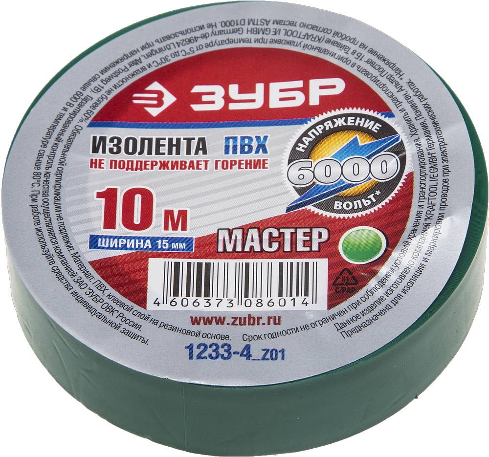 Изолента ПВХ, 15мм х 10м, зеленая ЗУБР "МАСТЕР"