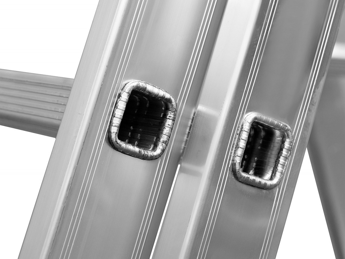 Прочное соединение ступеней с боковинами. Дополнительная опора для лучшей устойчивости. Выдвижные секции. Надежный механизм фиксации выдвижных секций. Рифленые ступени. Противоскользящие опорные наконечники.
