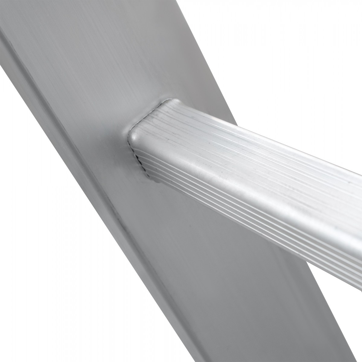 Рабочие положения: приставная лестница, приставная выдвижная лестница, стремянка, стремянка с выдвинутой секцией, функция «лестничный пролёт». Высокая прочность и надёжность при лёгком весе. Стойки и ступени из экструдированных алюминиевых профилей. Многократная развальцовка в соединении ступеней со стойками. Рифлёные ступени с шагом 260 мм для безопасного подъёма и спуска. Алюминиевые направляющие кронштейны для удержания выдвижной секции. Зацепы с автоматическим фиксатором. Широкая поперечная траверса 750 мм для максимальной устойчивости. Опорные наконечники-башмаки траверсы из двухкомпонентного пластика. Верхняя секция может использоваться как отдельная приставная лестница. Компактность при хранении и транспортировке.