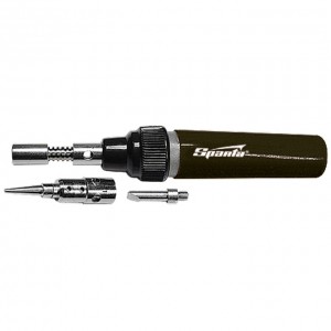 Удобная портативная газовая горелка общего назначения. Заправка осуществляется при помощи обычного баллончика для заправки зажигалок. Создает устойчивое, не подверженное воздействию ветра и дождя пламя температурой около 1300°C. В комплект входит две насадки для пайки.