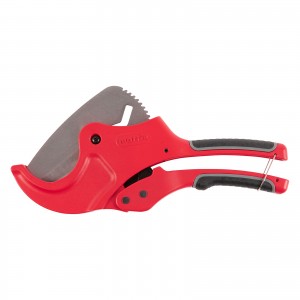 Универсальные ножницы для резки изделий из ПВХ с порошковым покрытием рукояток применяются для разрезания пластиковых труб диаметром до 63 мм, а также профилей, плинтусов, галтелей, реек, планок, резиновых шлангов и других предметов. Механизм автоматического раскрытия. Нож у инструмента прямой, поэтому он может резать плоские заготовки. Ножницы пригодятся для выполнения сантехнических и отделочных работ. Режущее полотно изготовлено из нержавеющей стали (3CR13). Корпус защищен порошковым покрытием. Храповый механизм для удобства в работе. Ножницы удобны в хранении и транспортировке за счет блокировки рукояток в сведенном положении.